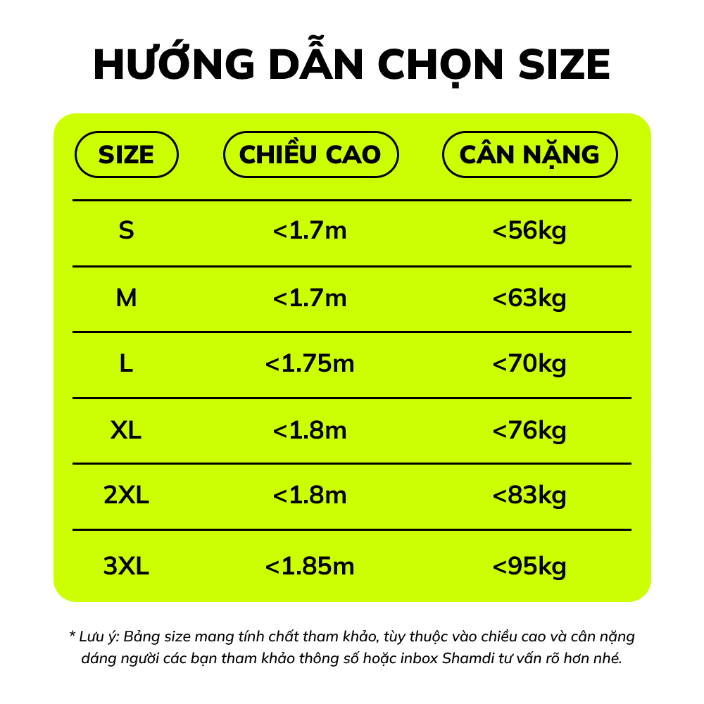 * Lưu ý: Bảng size mang tính chất tham khảo, tùy thuộc vào chiều cao và cân nặng dáng người các bạn tham khảo thông số hoặc inbox Shamdi tư vấn rõ hơn nhé.