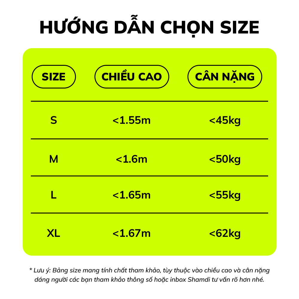 * Lưu ý: Bảng size mang tính chất tham khảo, tùy thuộc vào chiều cao và cân nặng dáng người các bạn tham khảo thông số hoặc inbox Shamdi tư vấn rõ hơn nhé.