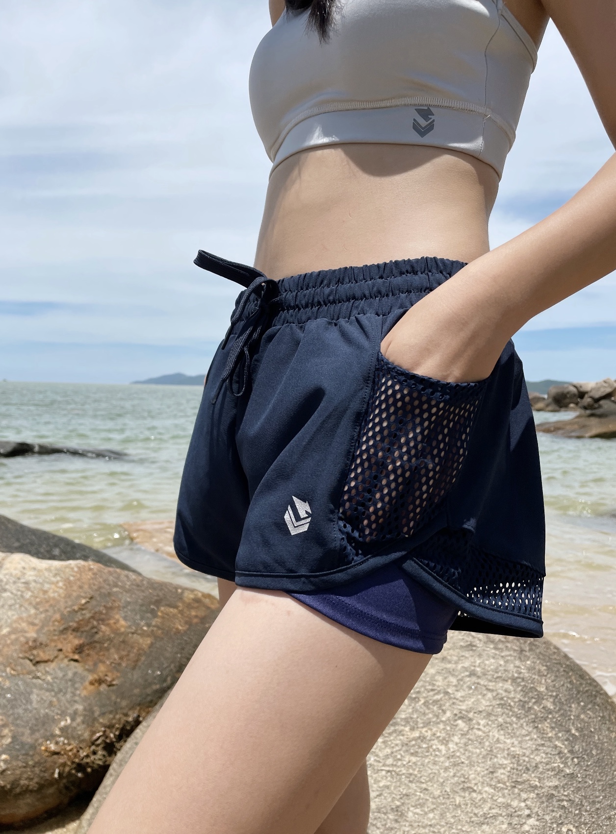 • Quần với thiết kế 2 lớp, lớp ngoài vải Si phối vải lưới năng động, lớp trong vải Polyester co giãn.